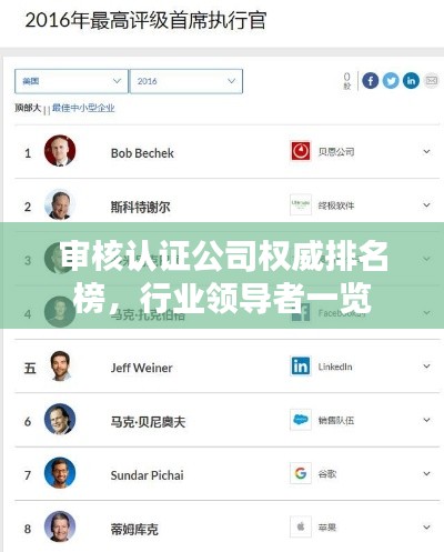 随着全球化和商业发展的不断推进,审核认证公司在保障产品质量和企业信誉方面发挥着越来越重要的作用,本文将为您介绍审核认证公司的排名,带您了解行业内的领导者。
